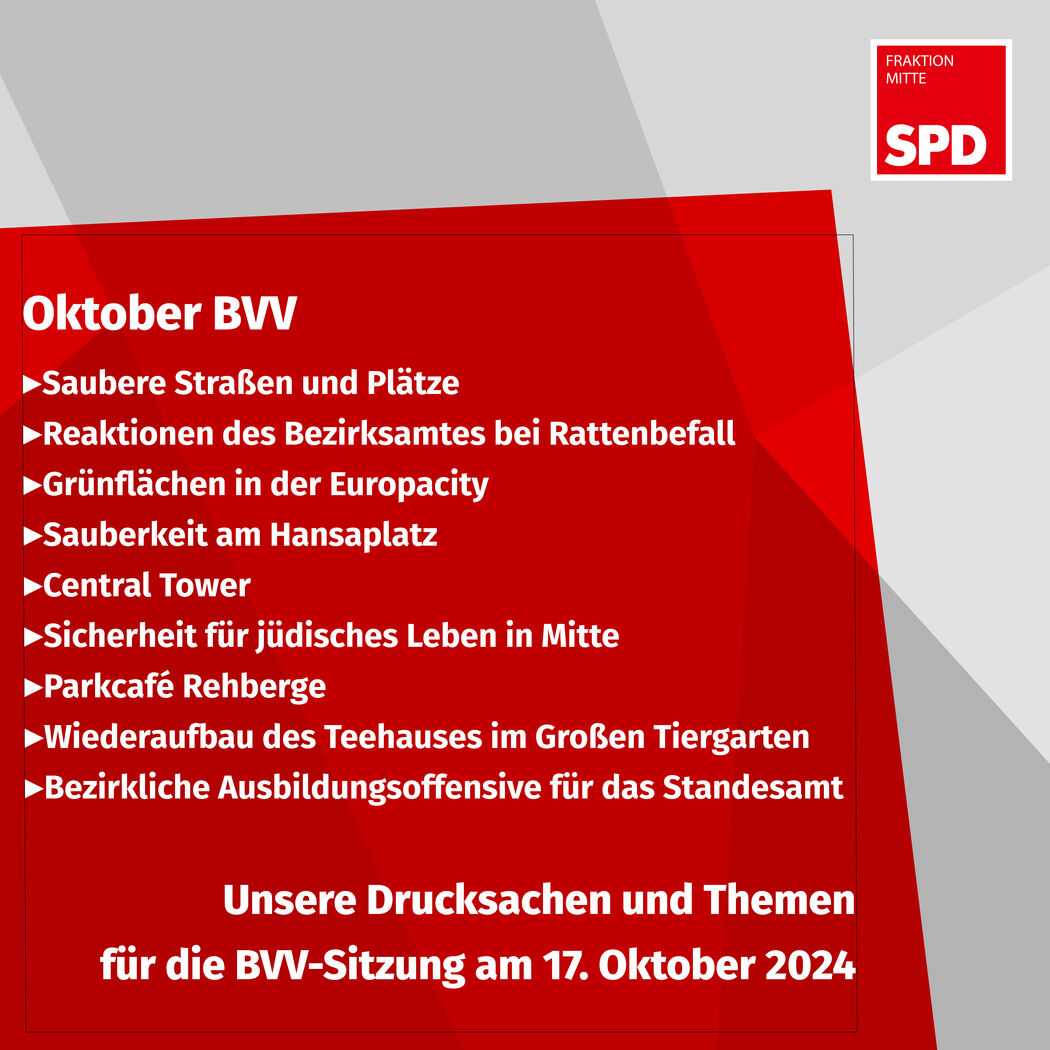 In der BVV-Sitzung am 17.10.2024 steht für uns das Thema „Sauberkeit im Bezirk Mitte“ ganz oben auf der Tagesordnung. Mit gleich mehreren Anträgen und Drucksachen greifen wir dieses zentrale Anliegen auf.